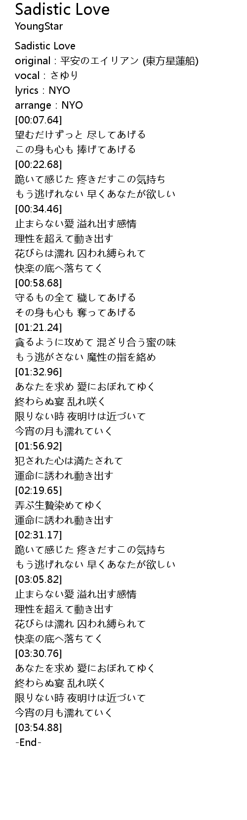 | [00:02.23] | original:平安のエイリアン (東方星蓮船) |