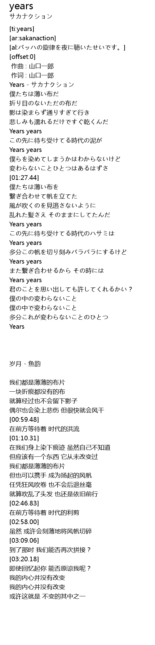| [00:00.62] | Years - サカナクション |