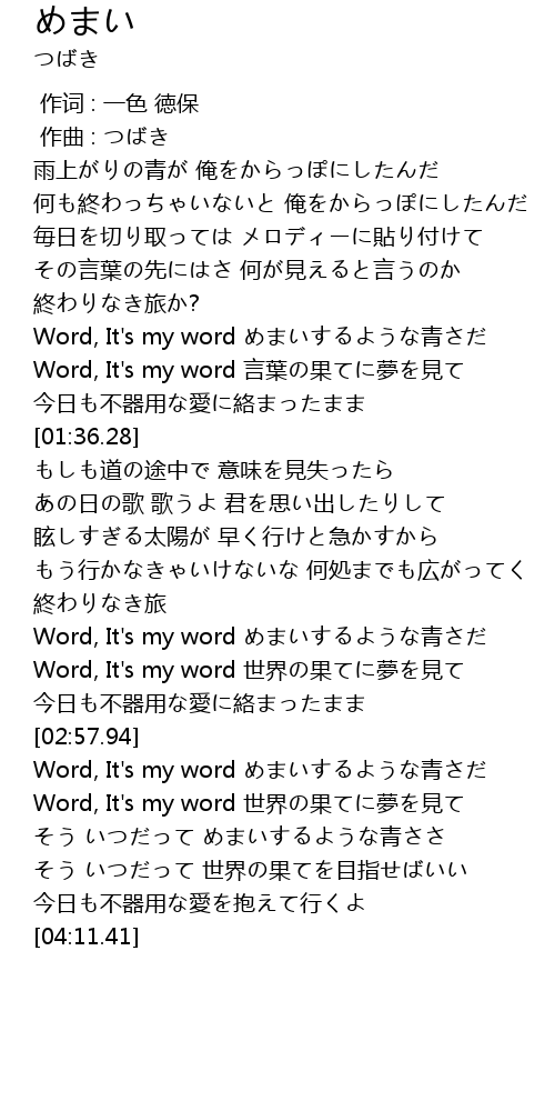 | [03:18.14] | Word, It's my word めまいするような青さだ |