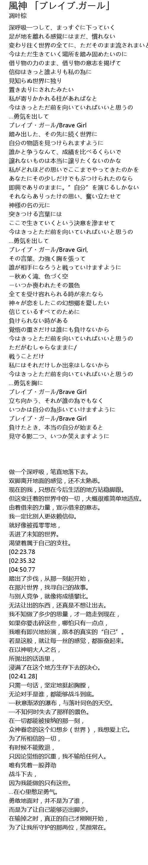 | [01:12.95][02:35.32] | 请拿出勇气。 |