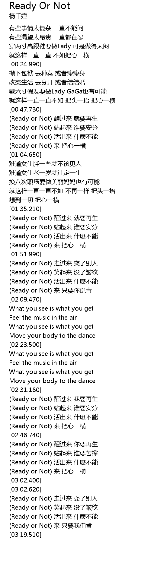 | [02:51.270] | Ready or Not zhàn qǐ lái shuí yào kǔ chēng |