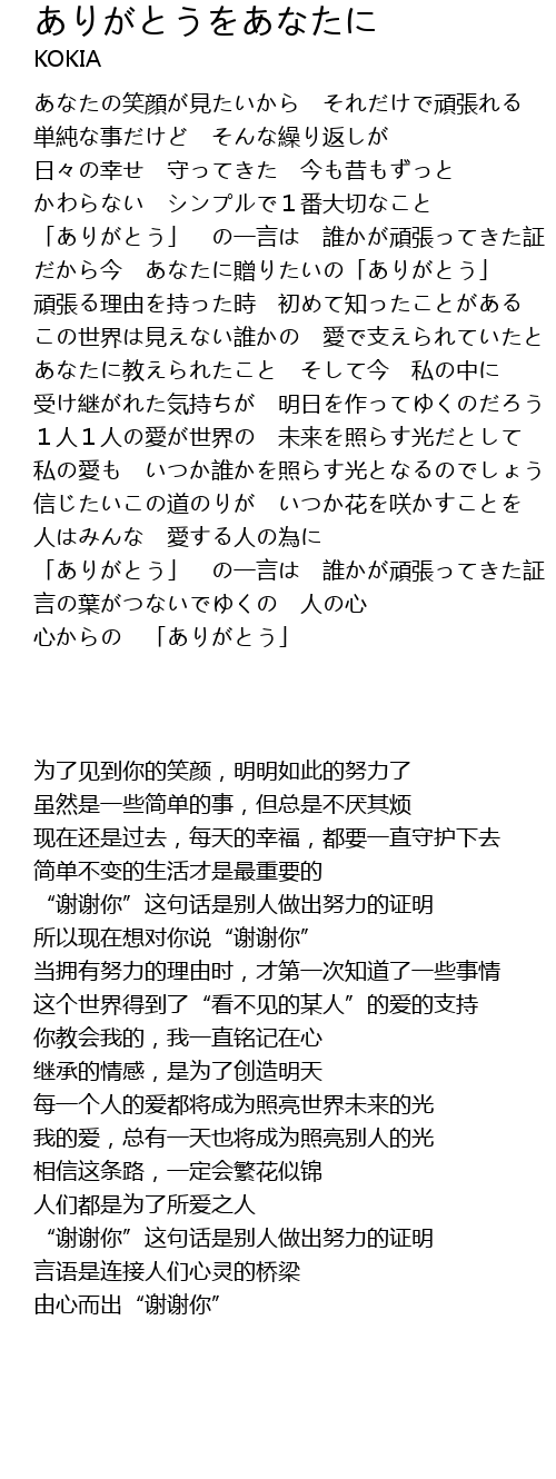 | [01:15.180] | 「ありがとう」 の一言は 誰かが頑張ってきた証 |