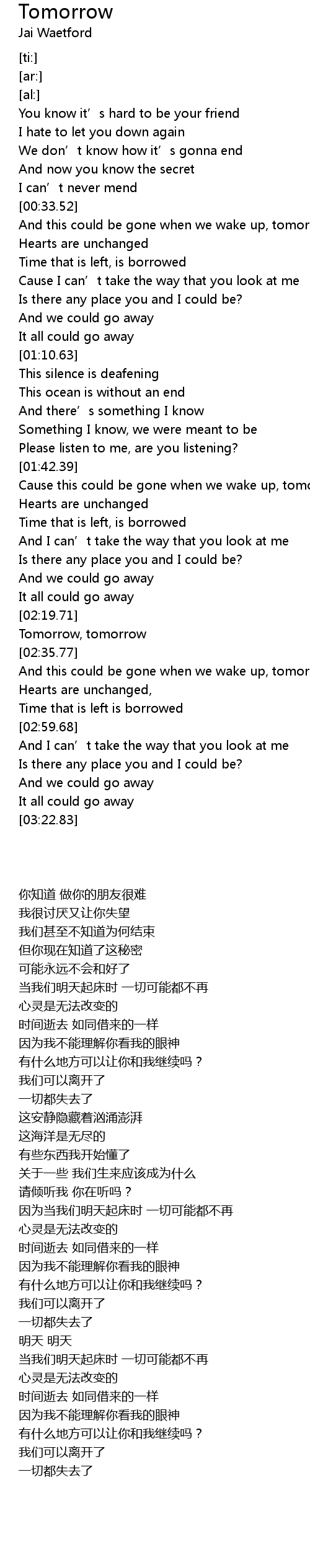 | [00:33.77] | 当我们明天起床时 一切可能都不再 |