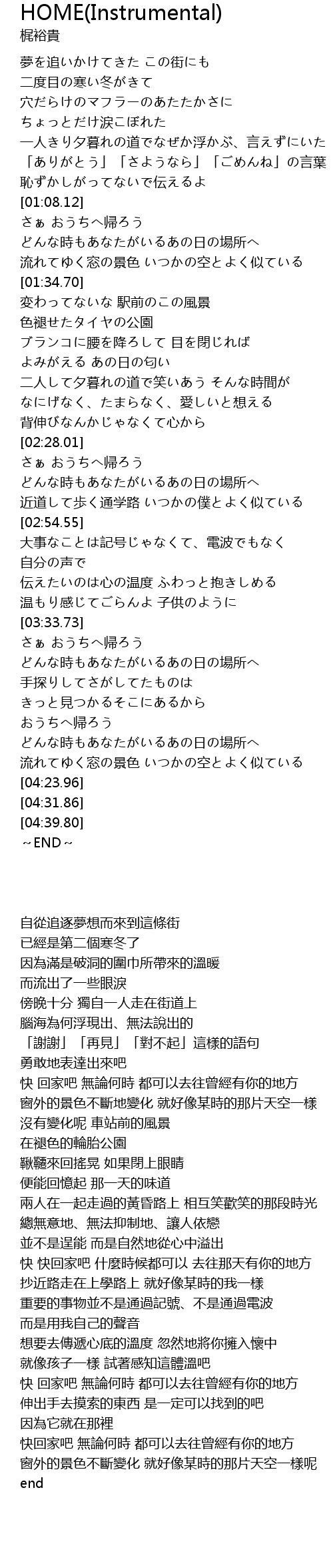 | [03:58.52] | 快回家吧 無論何時 都可以去往曾經有你的地方 |