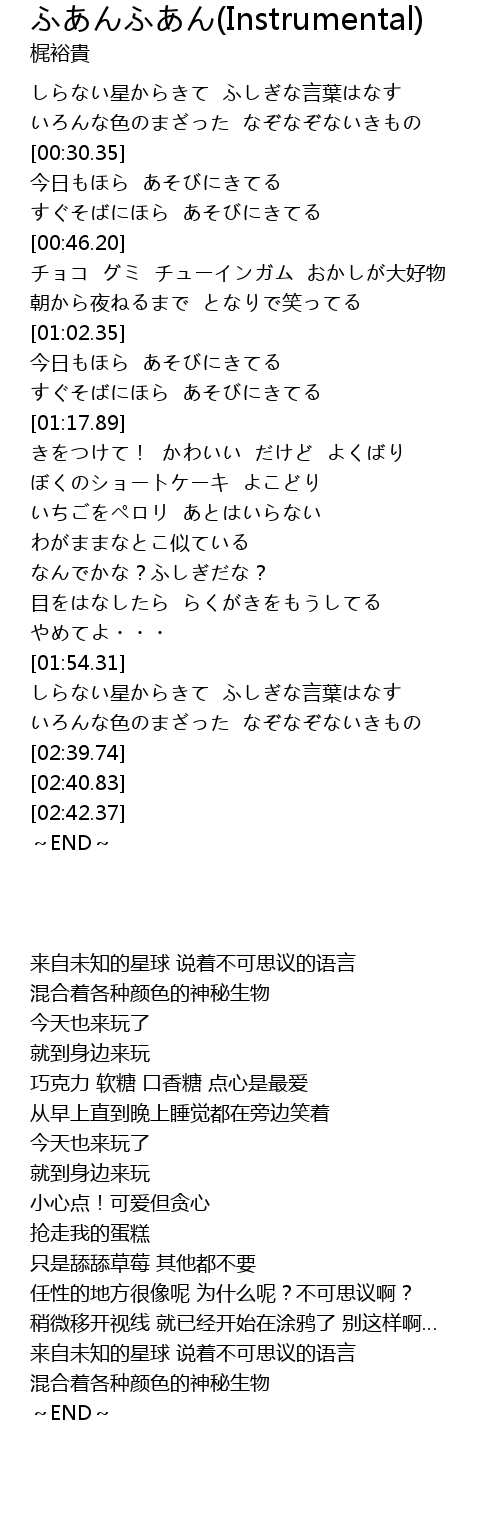 | [00:47.96] | チョコ グミ チューインガム おかしが大好物 |