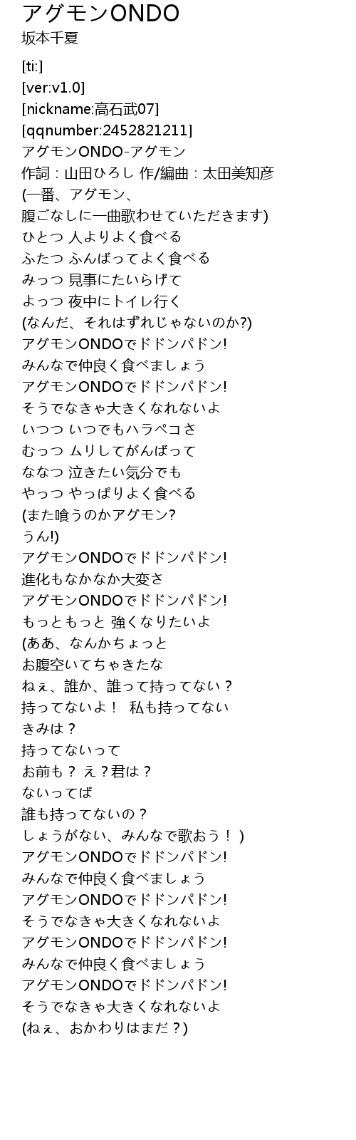 | [02:30.57] | アグモンONDOでドドンパドン! |