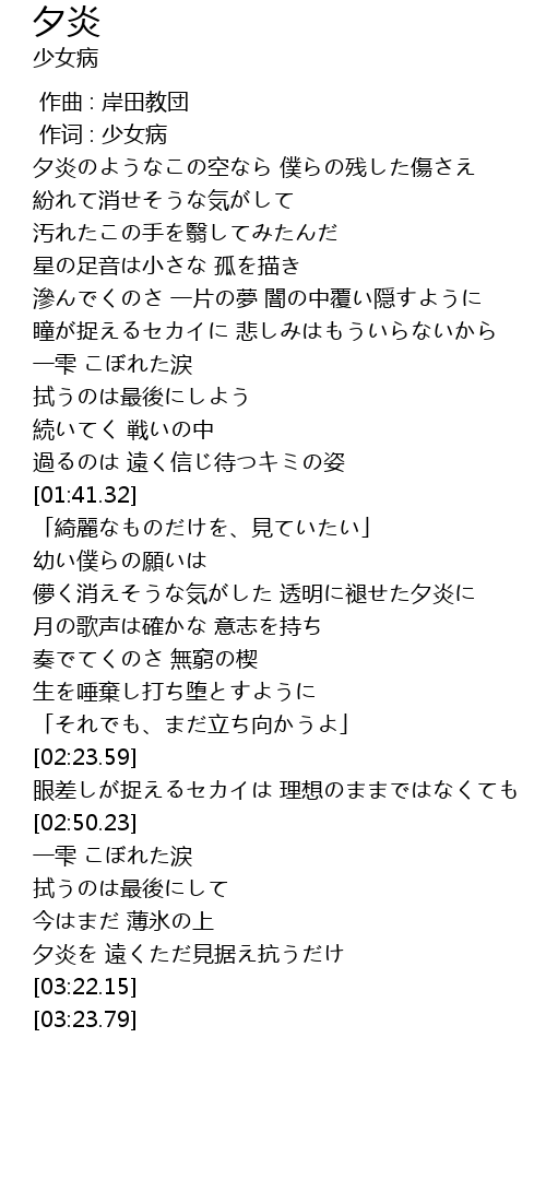 | [01:50.75] | 儚く消えそうな気がした 透明に褪せた夕炎に |