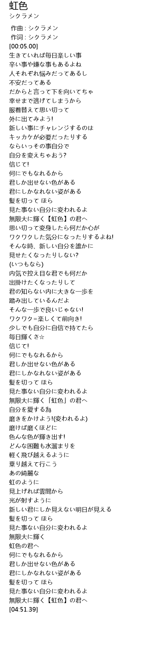 | [01:45.41] | 無限大に輝く【虹色】の君へ |