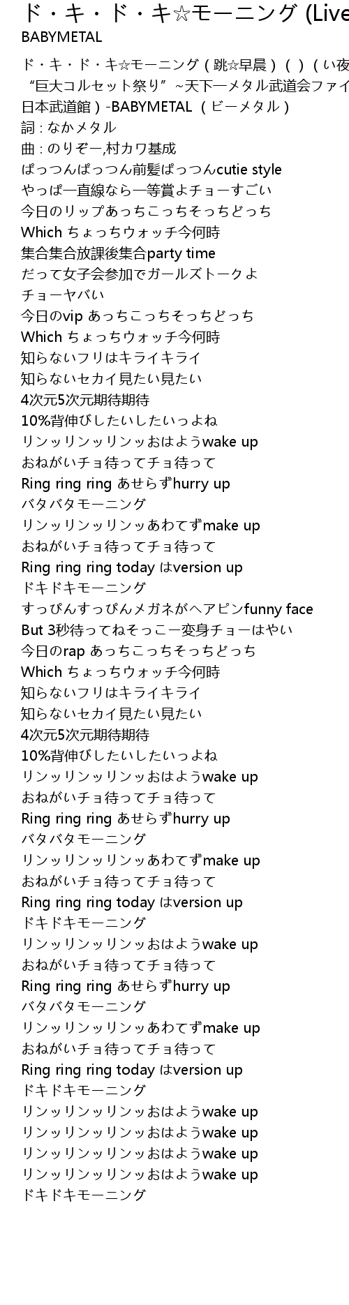 | [00:00.00] | ド・キ・ド・キ☆モーニング(跳☆早晨)()(い夜LEGEND “巨大コルセット祭り”~天下一メタル武道会ファイナル~2014/3/1at 日本武道館)-BABYMETAL (ビーメタル) |