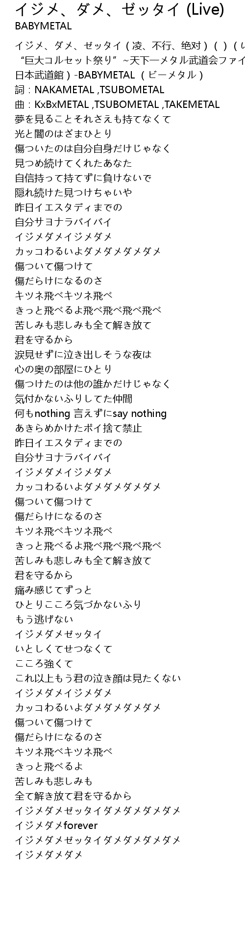 | [00:00.00] | イジメ、ダメ、ゼッタイ(凌、不行、绝对)()(い夜LEGEND “巨大コルセット祭り”~天下一メタル武道会ファイナル~2014/3/1at 日本武道館)-BABYMETAL (ビーメタル) |