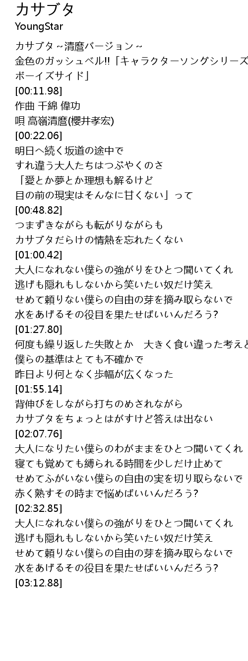| [00:08.28] | 金色のガッシュベル!!「キャラクターソングシリーズ ボーイズサイド」 |
