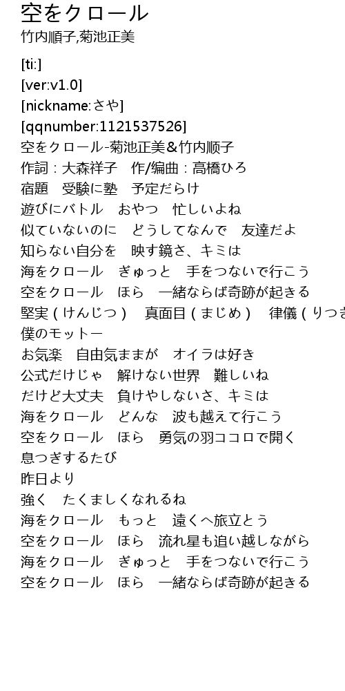 | [00:05.20] | 空をクロール-菊池正美&竹内顺子 |