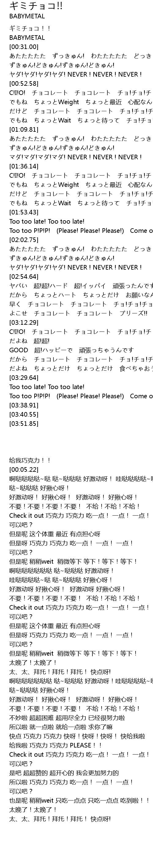 | [03:03.95] | 快点 巧克力 巧克力 快呀!快呀!快呀! 快给我啦 |