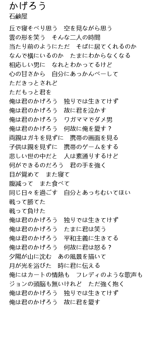 | [01:34.10] | 俺は君のかげろう ワガママでダメ男 |
