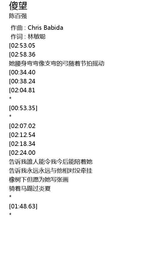 | [00:45.99][02:04.81] | 岸上尽是热沙白茫茫陪着我悄悄傻望 |