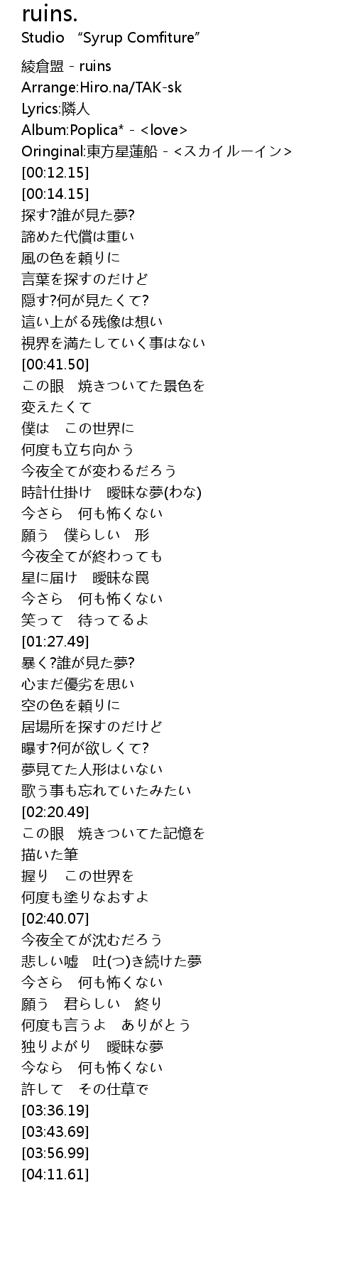 | [00:10.00] | Oringinal:東方星蓮船 - <スカイルーイン> |