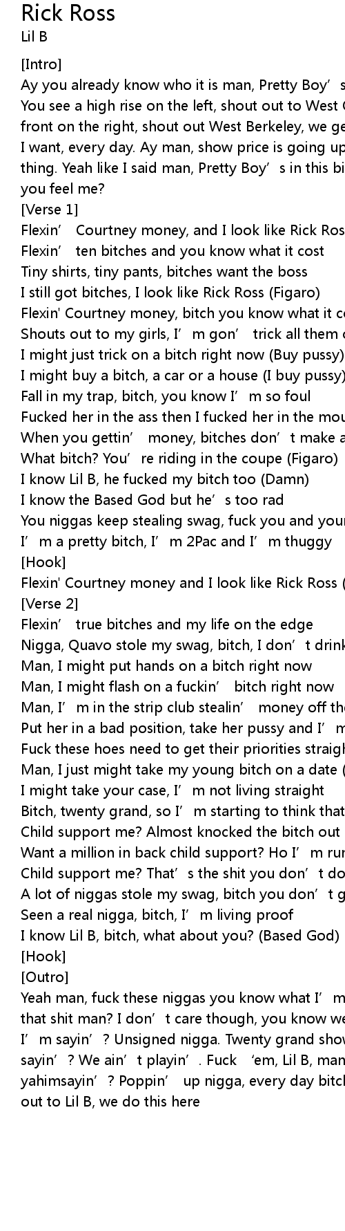 | Yeah man, fuck these niggas you know what I’m saying , baby momma drama all that shit man? I don’t care though, you know we rockin’ up. You know what I’m sayin’? Unsigned nigga. Twenty grand shows bitch, you know what I’m sayin’? We ain’t playin’. Fuck ‘em, Lil B, man, we ain’t doin’ this, yahimsayin’? Poppin’ up nigga, every day bitch. Yup like I said man, shout out to Lil B, we do this here |