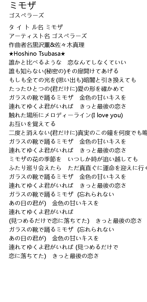 | [03:28.56] | ガラスの靴で踊るミモザ (忘れられない あの日の君が) 金色の甘いキスを |
