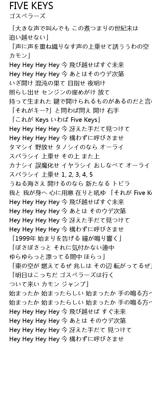 | 我と 我が身へ 心に用意 在りと吼ゆ 「それが Five Keys」 | |