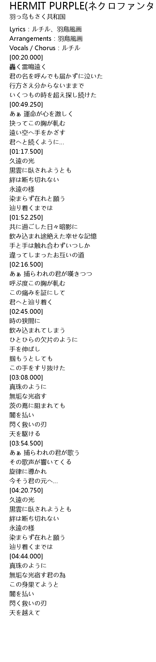 | [00:02.000] | Lyrics:ルチル、羽鳥風画 |