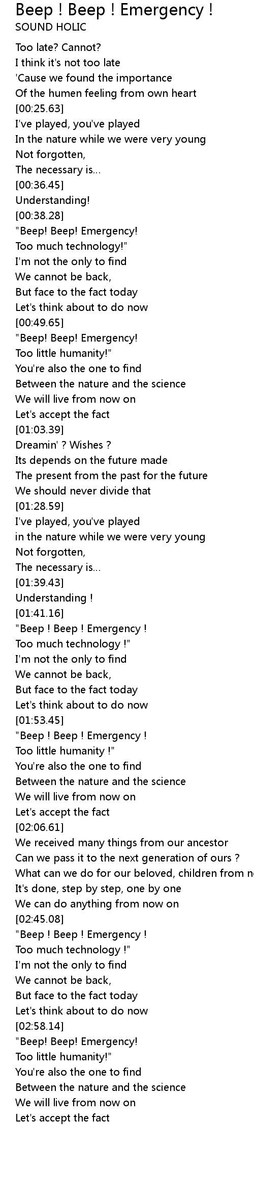 | [02:59.27] | " Beep! Beep! Emergency! |