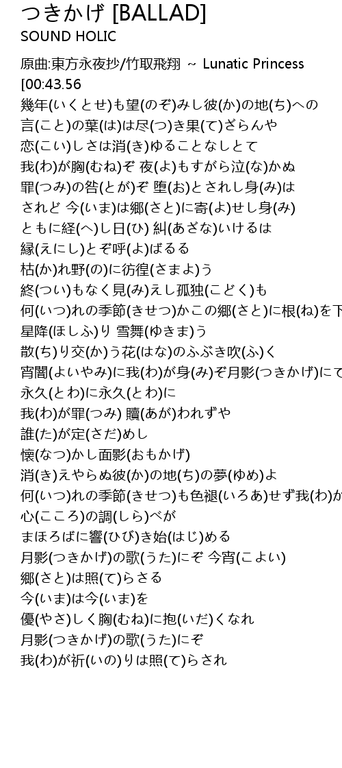 | [00:18.05] | 原曲:東方永夜抄/竹取飛翔 ~ Lunatic Princess |