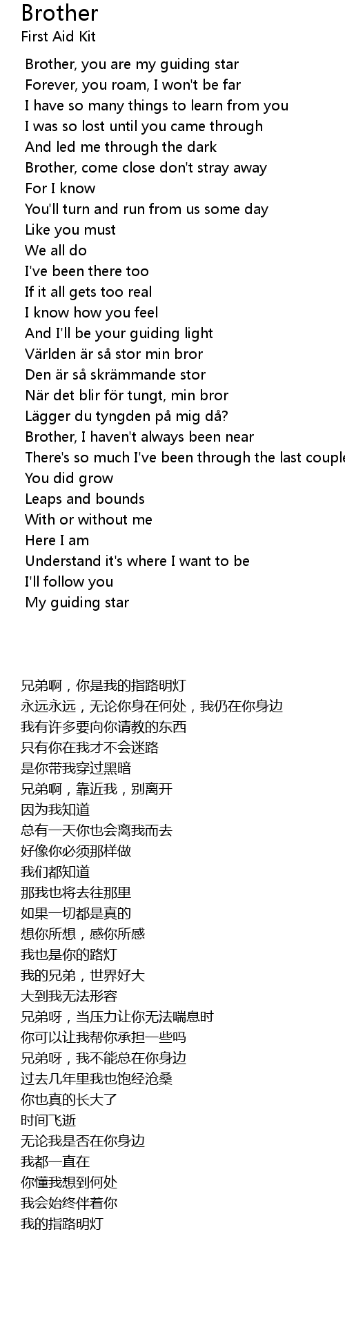 | [00:09.555] | 兄弟啊,你是我的指路明灯 |