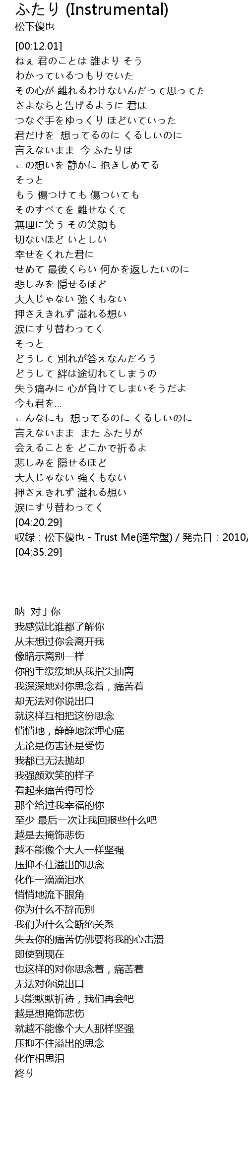 | [04:27.29] | 収録:松下優也 - Trust Me(通常盤)/発売日:2010/02/17 |