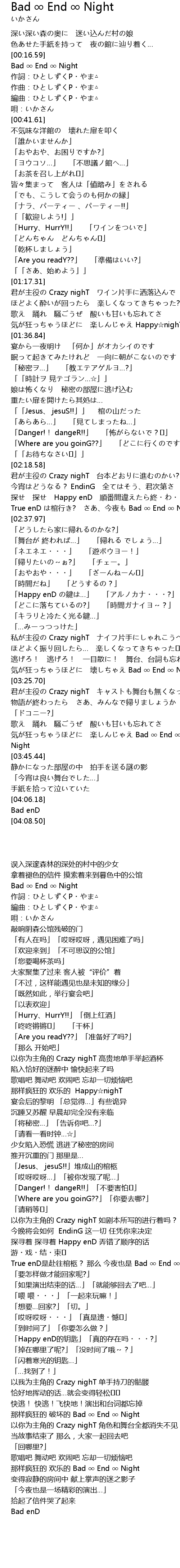 | [03:39.94] | 気が狂っちゃうほどに 楽しんじゃえ Bad ∞ End ∞ Night |
