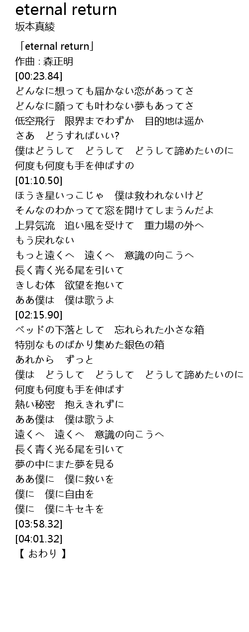 | [00:44.82] | 低空飛行 限界までわずか 目的地は遥か |