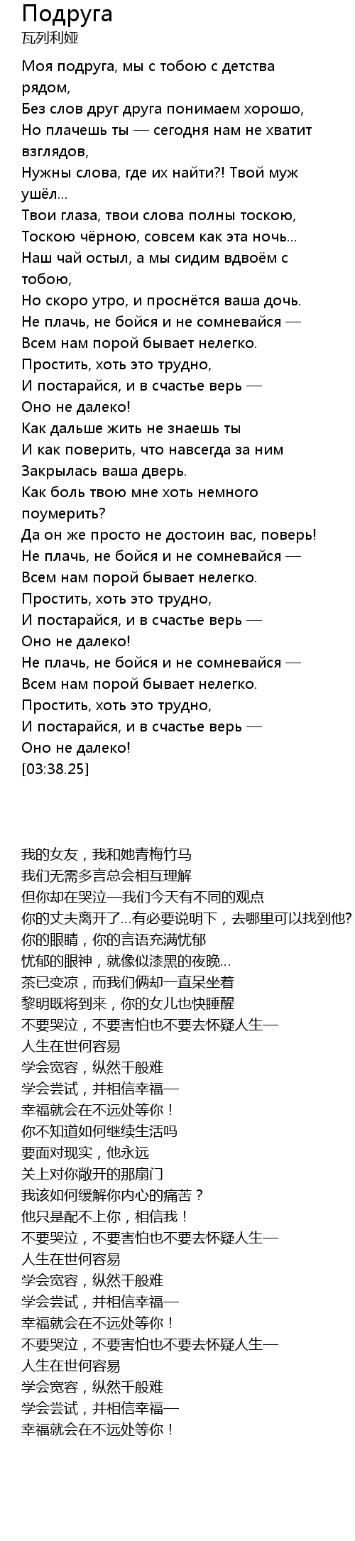 | [00:15.05] | Моя подруга, мы с тобою с детства рядом, |