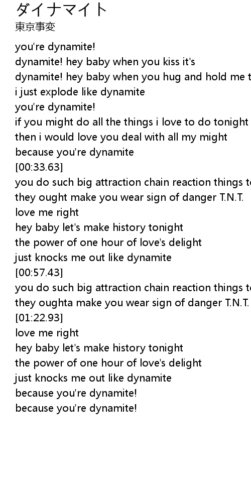 | [00:04.46] | dynamite! hey baby when you kiss it's |