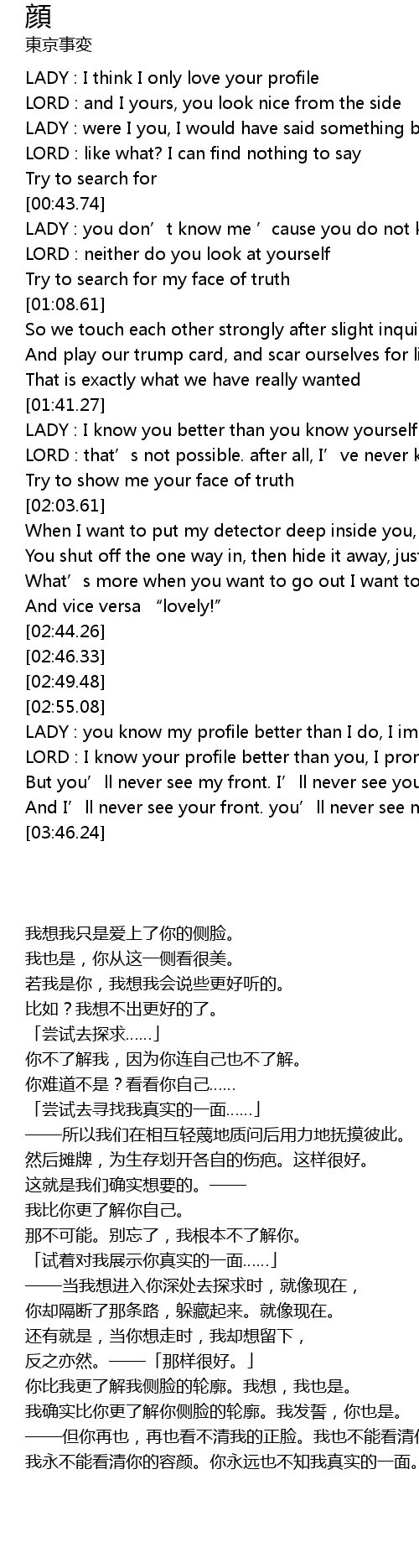 | [03:31.83] | ——但你再也,再也看不清我的正脸。我也不能看清你的容颜。 |