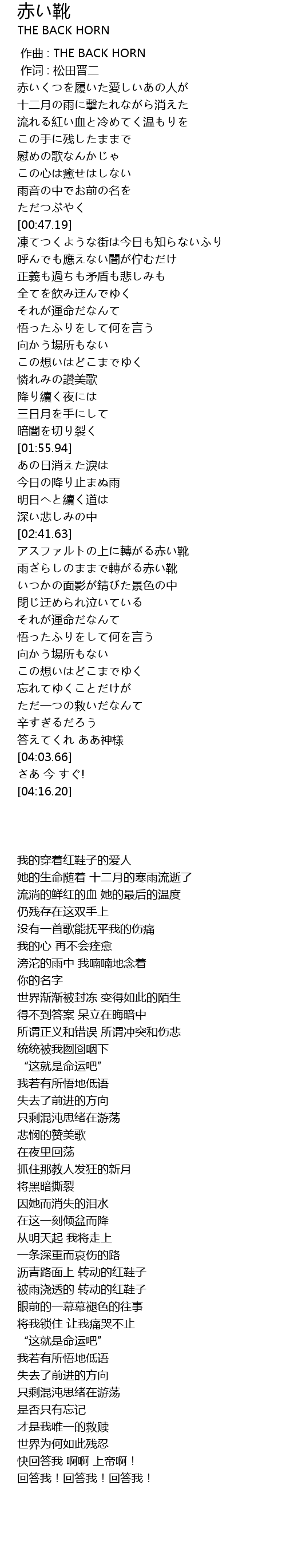 | [00:17.02] | 赤いくつを履いた愛しいあの人が |