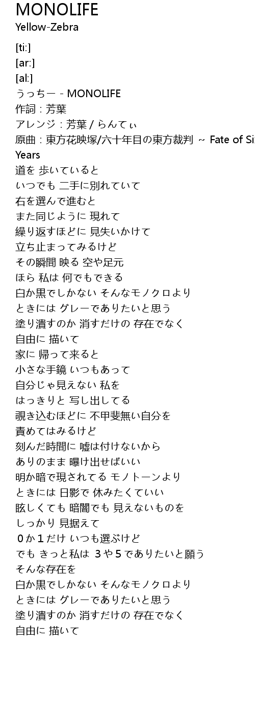 | [00:12.42] | 原曲:東方花映塚/六十年目の東方裁判 ~ Fate of Sixty Years |