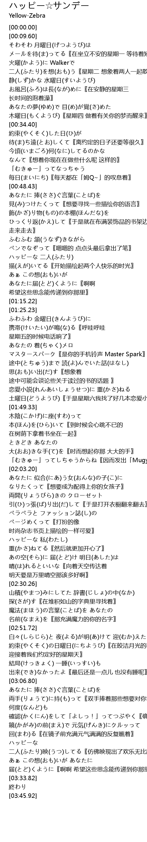 | [02:19.69] | ハッピーな 私(わたし) 重(かさ)ねてる〖然后就更加开心了〗 |