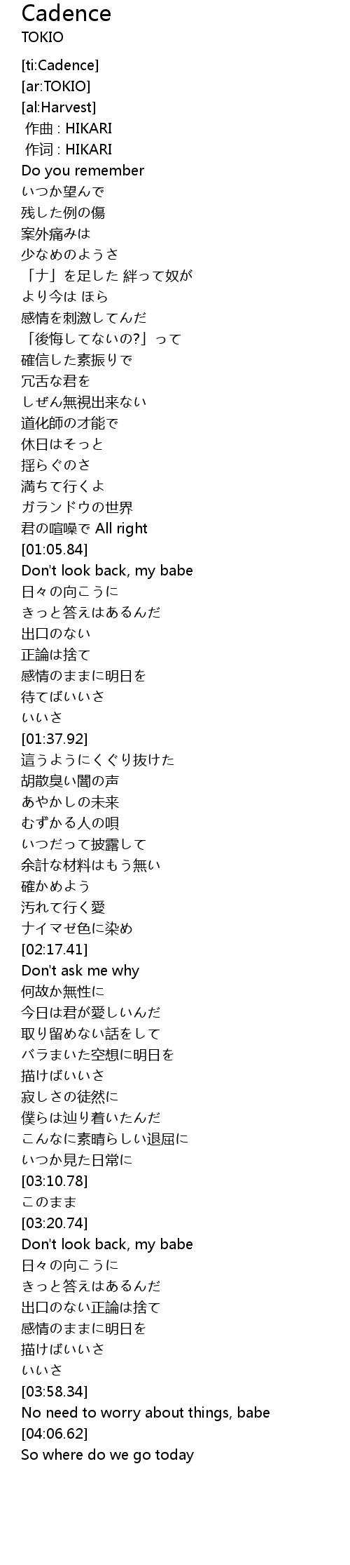 | [03:24.82] | Don' t look back, my babe |