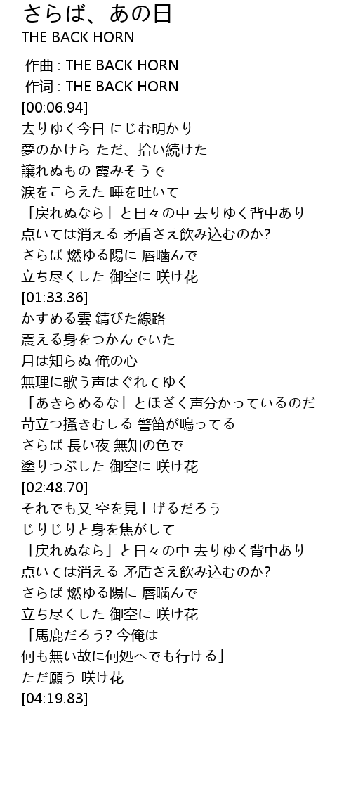 | [00:01.00] | zuò cí : THE BACK HORN |