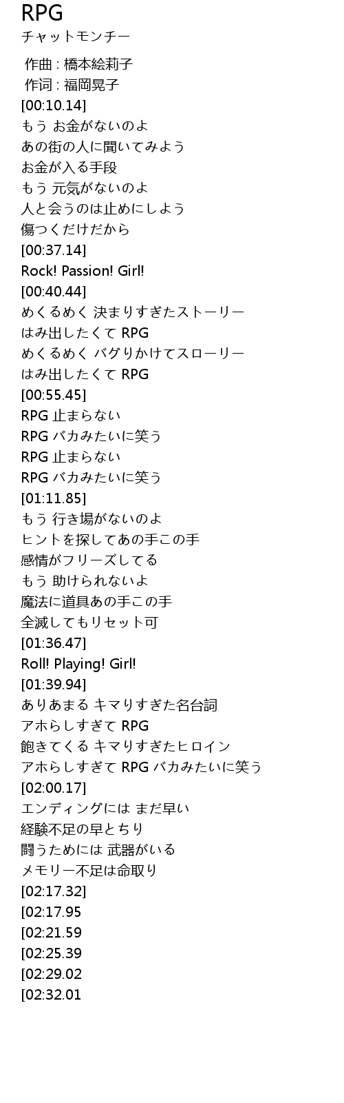 | [02:32.80][02:17.95] | RPG 止まらない |