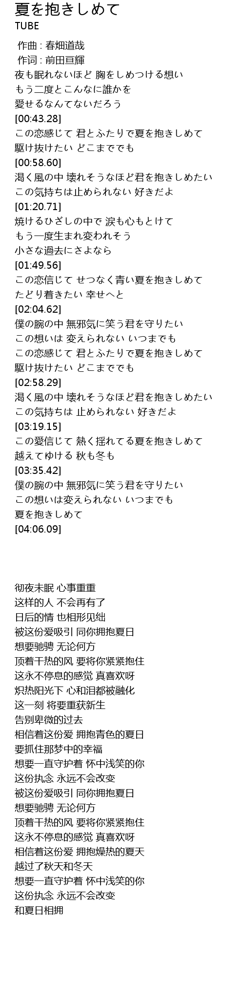 | [02:43.72] | この恋感じて 君とふたりで夏を抱きしめて |