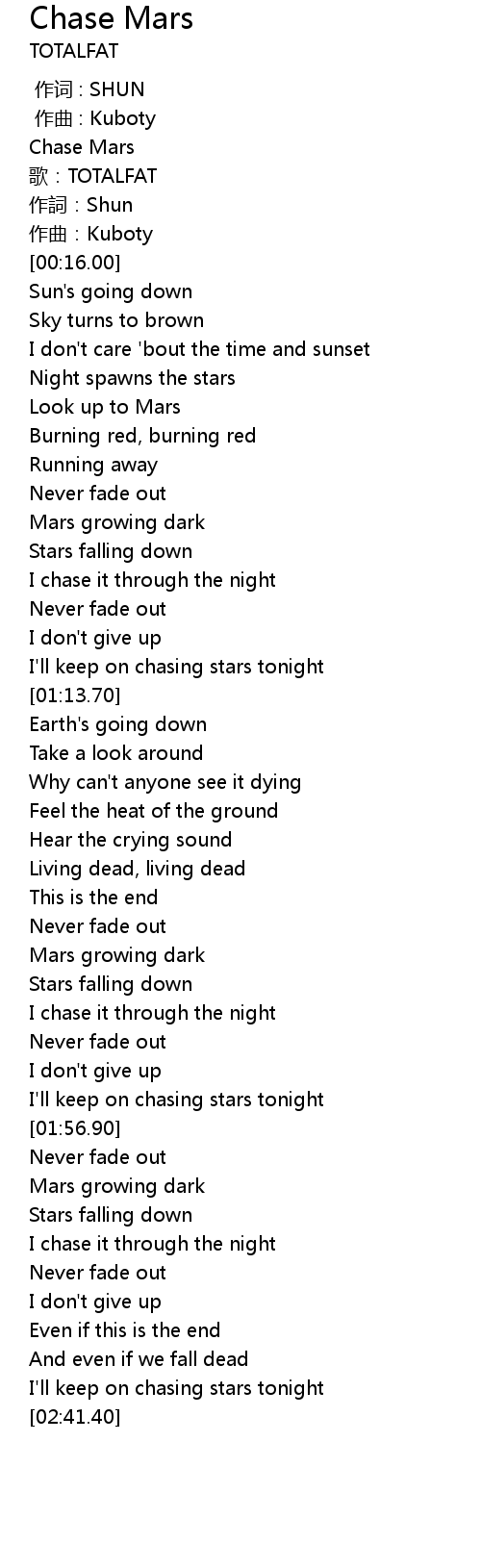| [02:35.65] | I'll keep on chasing stars tonight |