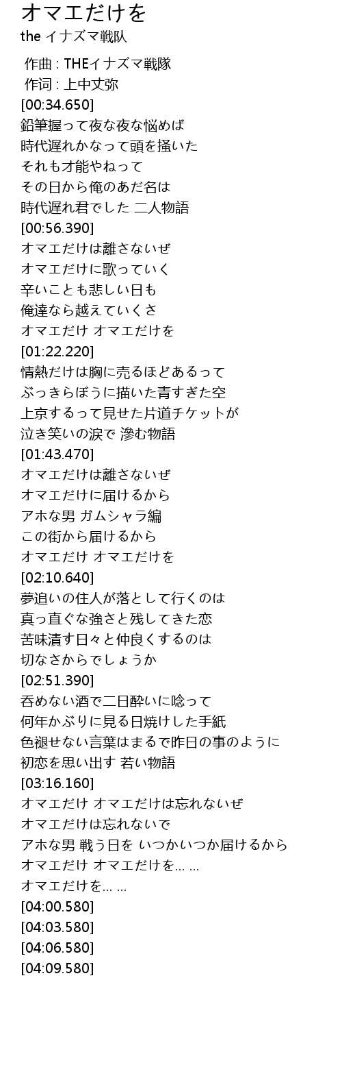 | [03:16.860] | オマエだけ オマエだけは忘れないぜ |