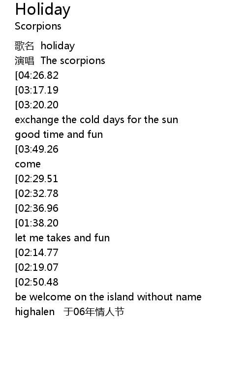 | [03:32.05][03:20.20][02:07.63][01:58.65][01:03.76][00:53.21] | you d like a holiday |