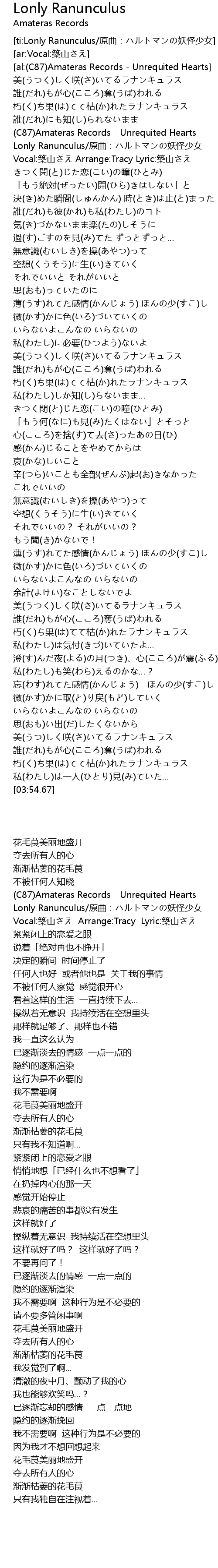 | [00:18.81] | Lonly Ranunculus/原曲:ハルトマンの妖怪少女 |