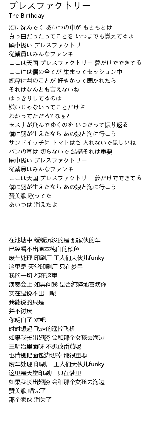 | [00:53.91] | 廃車扱い プレスファクトリー 従業員はみんなファンキー |