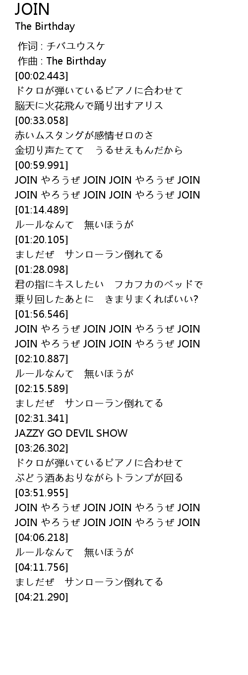 | [02:04.304] | JOIN やろうぜ JOIN JOIN やろうぜ JOIN |