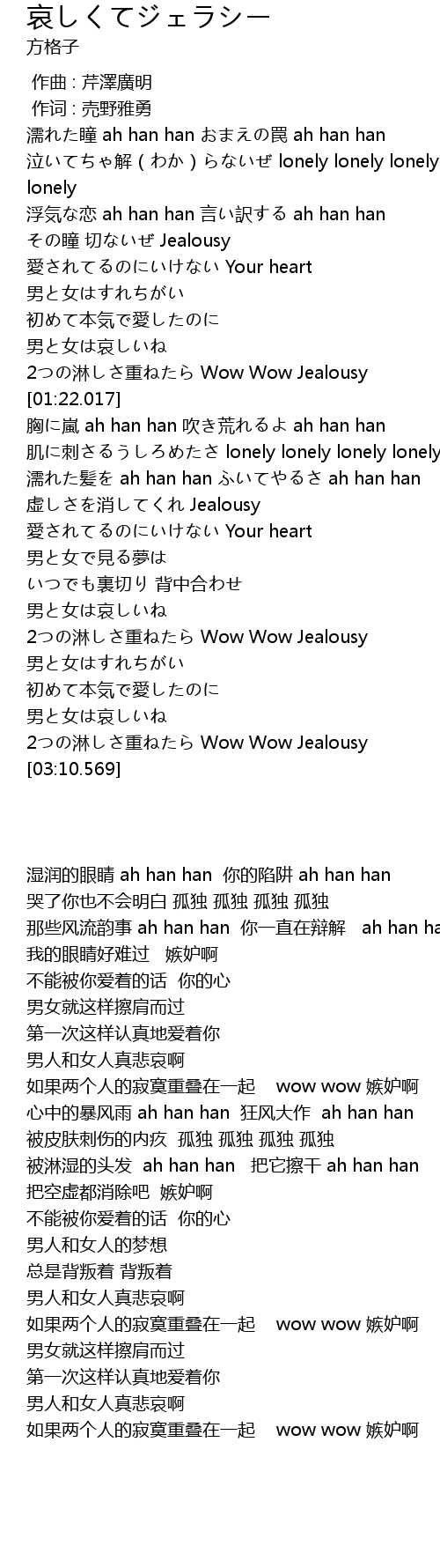 | [03:01.065] | 2つの淋しさ重ねたら Wow Wow Jealousy |