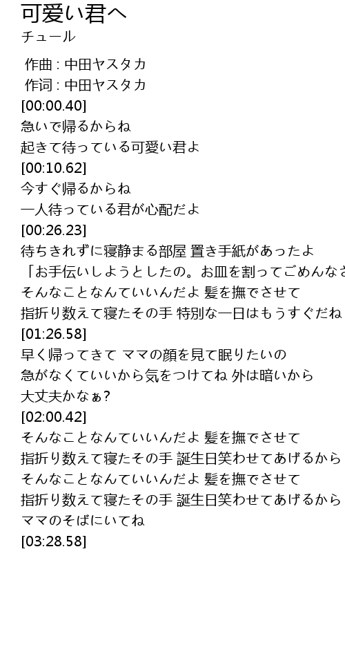 | [01:28.07] | 早く帰ってきて ママの顔を見て眠りたいの |