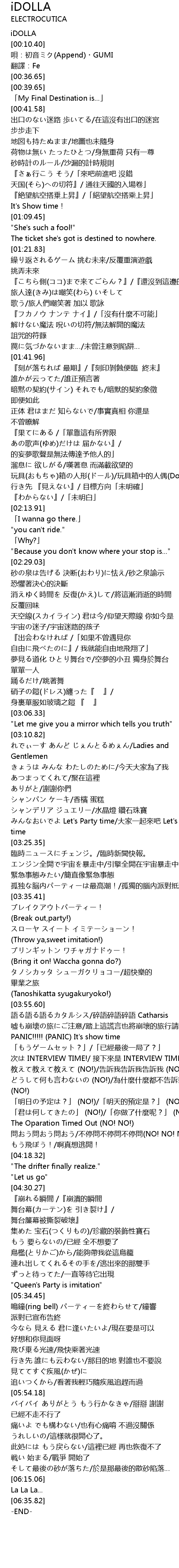 | [03:58.76] | 嘘も崩壊の旅にご注意/踏上這謊言也將崩壞的旅行請注意 |