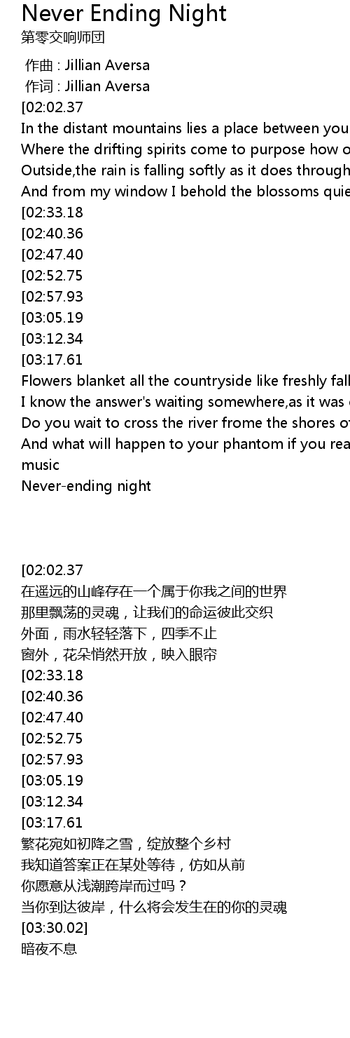 | [01:11.77][02:33.18][04:37.63] | Never-ending night,hear me crying. |